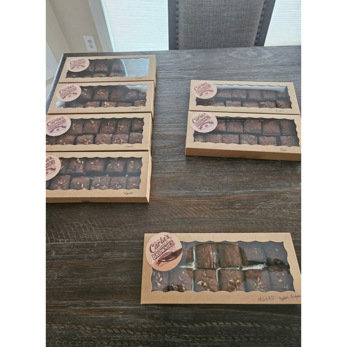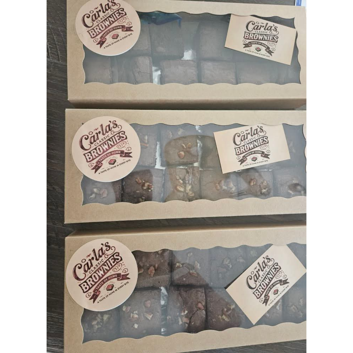 “Just tasted my order of brownies from Carla’s Classic Brownies and let me tell you!! I ordered one dozen plain and one dozen with pecans. The packaging is great, and I like that she separated the plain from the pecan. Both are very moist, and not overly sweet. I favor a corner piece as the edges tend to get a bit crunchy but these are the perfect bite in each bite! Very good!!